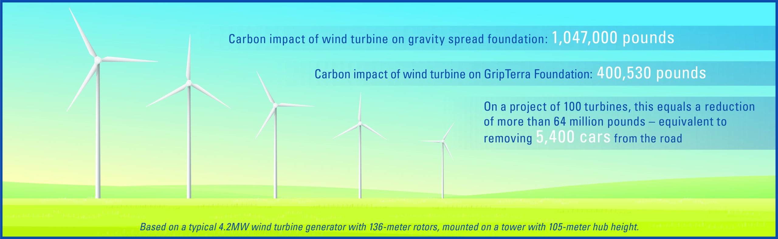 When it comes to green energy, GripTerra’s innovative new solution is the most sustainable and eco-friendly foundation for wind turbines on the market today. As an example, the construction of a gravity spread foundation supporting a typical 4.2 MW wind turbine generator (WTG) releases over a million pounds of carbon dioxide into the atmosphere. In comparison, the construction of a second-generation pier foundation supporting the same WTG results in a 62% reduction in carbon dioxide emissions. For a 100-turbine wind project, this amounts to a total reduction of more than 64 million pounds of carbon dioxide, equivalent to removing about 5,400 cars from the road.