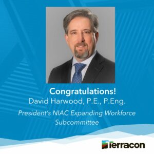 Terracon is influencing the industry’s ability to grow the workforce to meet U.S. infrastructure demands in coming years through the selection of key leaders to serve. David Harwood, P.E., P.Eng., director of business transformation, was named to the President’s National Infrastructure Advisory Council (NIAC) Expanding Workforce Subcommittee. Learn more about the NIAC.